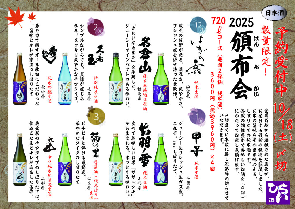 日本酒の頒布会のご案内です!いつもは1.8ℓですが今回は 720ml×2本 になります。