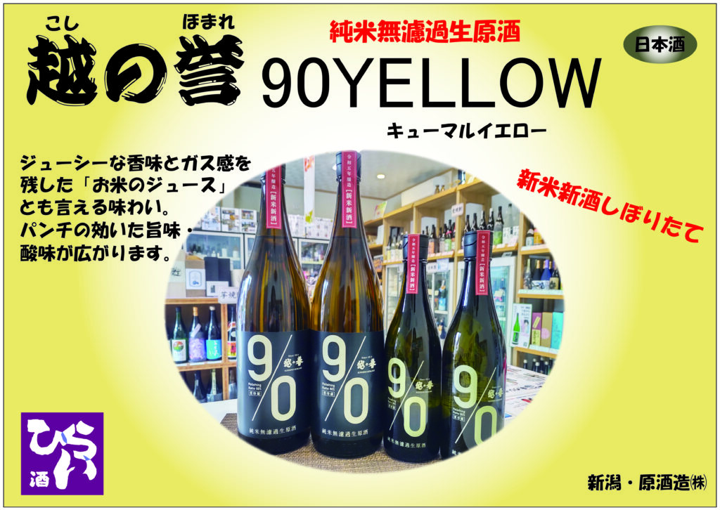 越の誉 純米 無濾過生原酒 90YELLOW しぼりたて ◎姫路で日本酒・地酒・獺祭・あらごし梅酒・獺祭焼酎・まんさくの花・ビワミンを買うなら地酒専門の、姫路しののめ『酒ひらい』 by株式会社平井商店