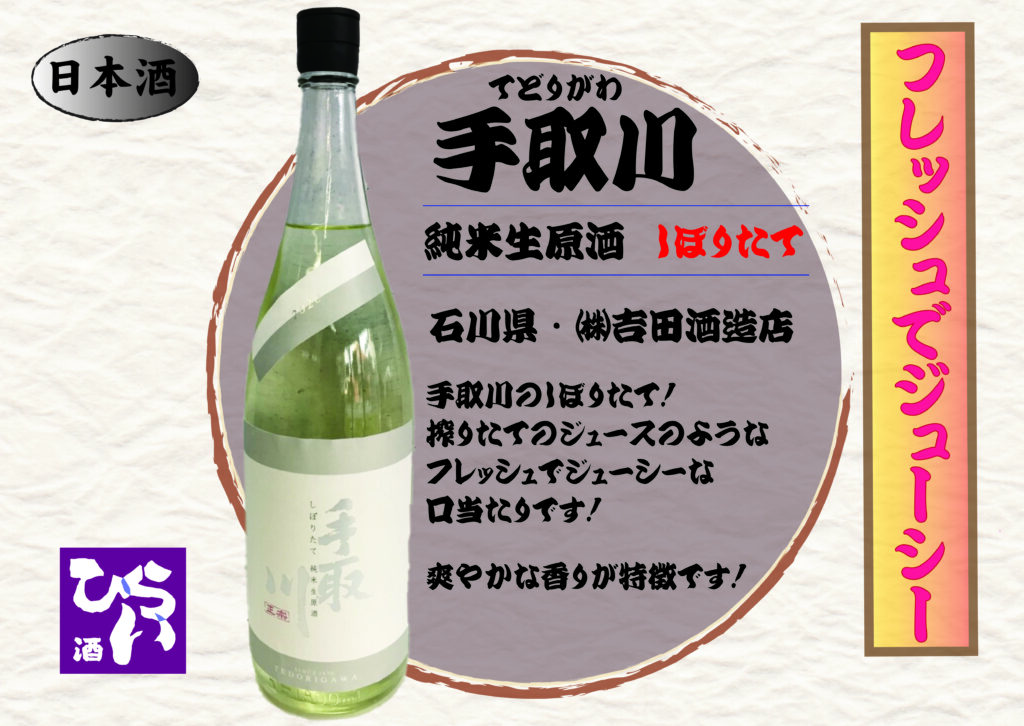 手取川 純米生原酒 しぼりたて ◎姫路で日本酒・地酒・獺祭・あらごし梅酒・獺祭焼酎・まんさくの花・ビワミンを買うなら地酒専門の、姫路しののめ『酒ひらい』 by株式会社平井商店