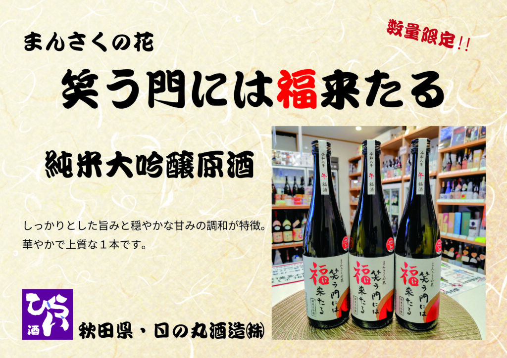 まんさくの花 笑う門には福来たる 720ml ◎姫路で日本酒・地酒・獺祭・あらごし梅酒・獺祭焼酎・まんさくの花・ビワミンを買うなら地酒専門の、姫路しののめ『酒ひらい』 by株式会社平井商店