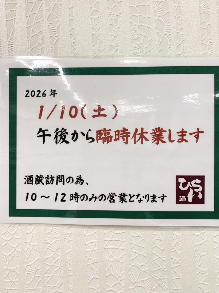 酒ひらい 本日12時までの営業となります