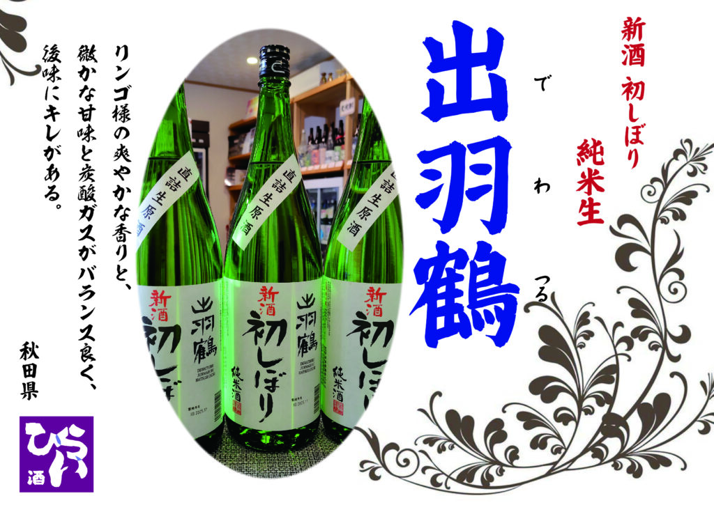 出羽鶴 新酒初しぼり 純米生 ◎姫路で日本酒・地酒・獺祭・あらごし梅酒・獺祭焼酎・まんさくの花・ビワミンを買うなら地酒専門の、姫路しののめ『酒ひらい』 by株式会社平井商店